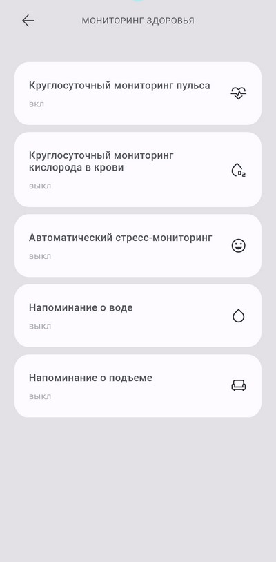 Мониторинг: сон, физическая активность, тренировки, сердечный ритм, стресс, SpO2, Датчики: акселерометр, датчик освещенности, ЧСС, пульсоксиметр (SpO2)