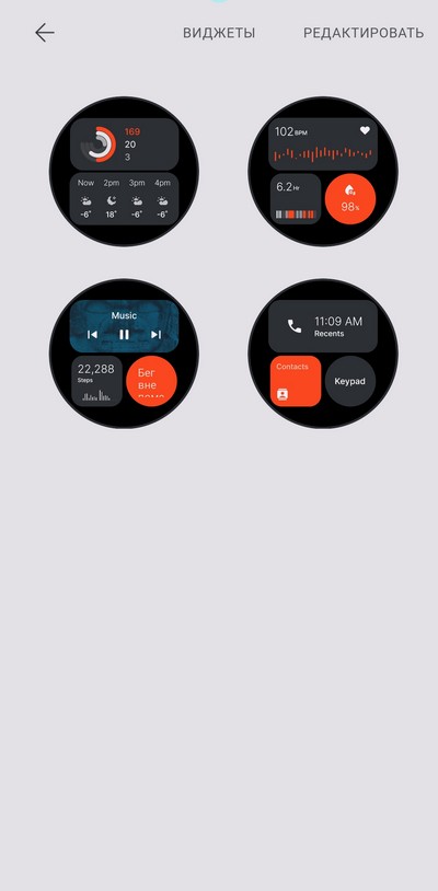 От циферблата влево-вправо - наборы виджетов (информеров). Сами виджеты редактировать нельзя, можно только убирать какие-то наборы. Их всего четыре штуки.