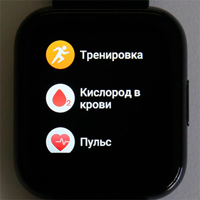 Свайп циферблата вверх - меню приложений: тренировка, уровень оксигенации, пульс, результаты тренировок, мониторинг сна, музыка, камера смартфона, поиск смартфона, медитация, будильник, секундомер, погода, настройки.