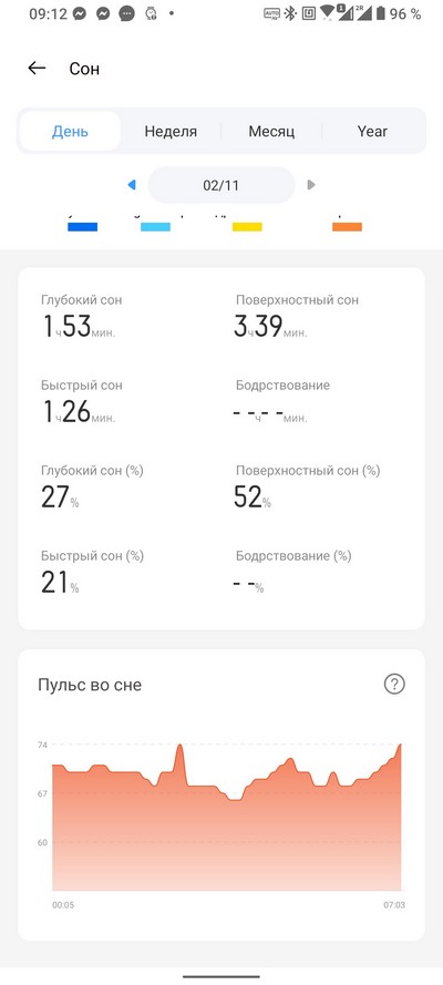Мониторинг сна - неплохо, вроде достаточно точно. Даже иногда определял и прибавлял дневной сон. Один раз был глюк: проснулся рано, через некоторое время заснул снова, а часы при этом записали только вторую половину сна, первую половину выкинули за ненадобностью. Но в остальных случаях пробуждения и период бодрствования фиксировали неплохо.