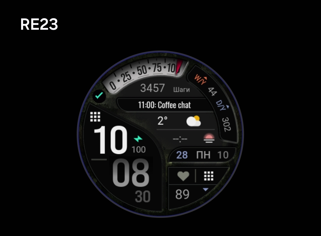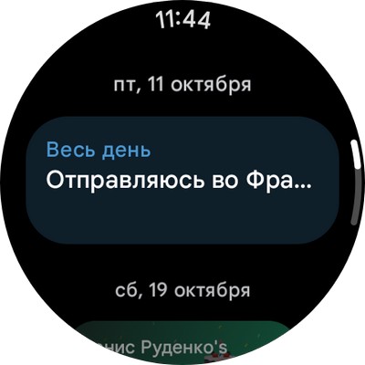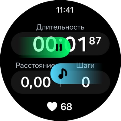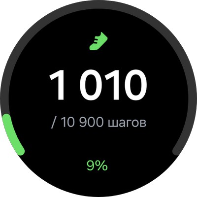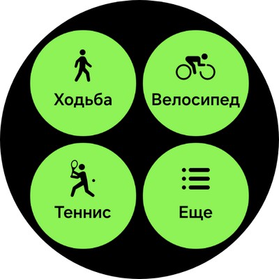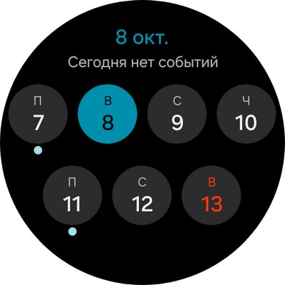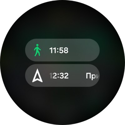 От циферблата свайп влево - виджеты приложений. Какие именно - вы настраиваете сами на смартфоне или в часах. Я ставлю сон, тренировки, шаги, календарь, напоминания, аудиоплеер (он может управлять воспроизведением со смартфона, а может воспроизводить треки, загруженные в часы).