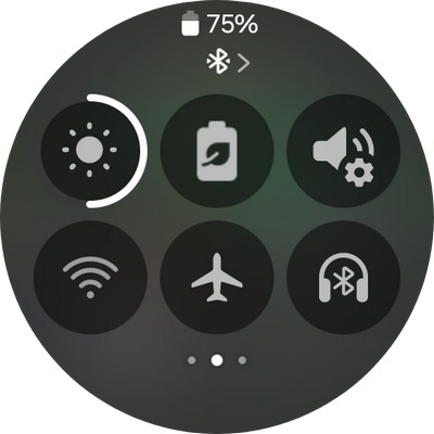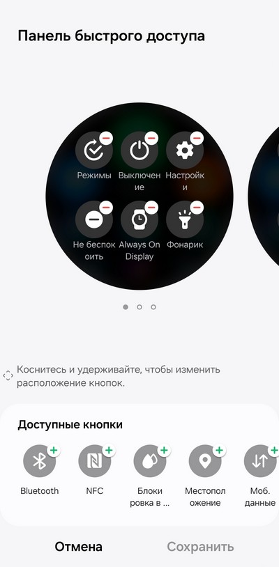 Свайп от циферблата вниз - - панель быстрого доступа: выбор режима (сон, театр), выключение, настройки, отключение любых уведомлений, режим AOD , отключение звука/вибрации, фонарик, яркость экрана, включение энергосбережения, громкость, Wi-Fi, самолетный режим, подключение наушников, поиск смартфона и так далее. Быстрые переключатели - их количество и порядок следования - можно настраивать.