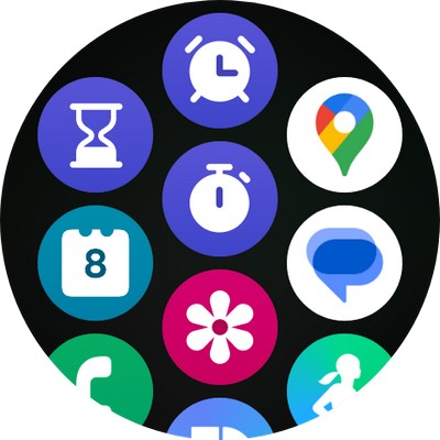 От циферблата свайп вверх - установленные приложения, коих довольно много. Также вы можете загружать любые приложения для часов из Google Play. У некоторых приложений могут быть различные скины - например, у секундомера. Также какие-то приложения могут выводить несколько экранов с информацией.
