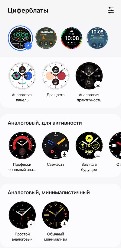 Вот эти часы в Galaxy Wearable. Главная страница, выбор циферблатов. В Google Play циферблатов для этих часов - великое множество на любой вкус, как платных, так и бесплатных. Многие циферблаты настраиваются под ваши предпочтения, также есть целые конструкторы циферблатов.