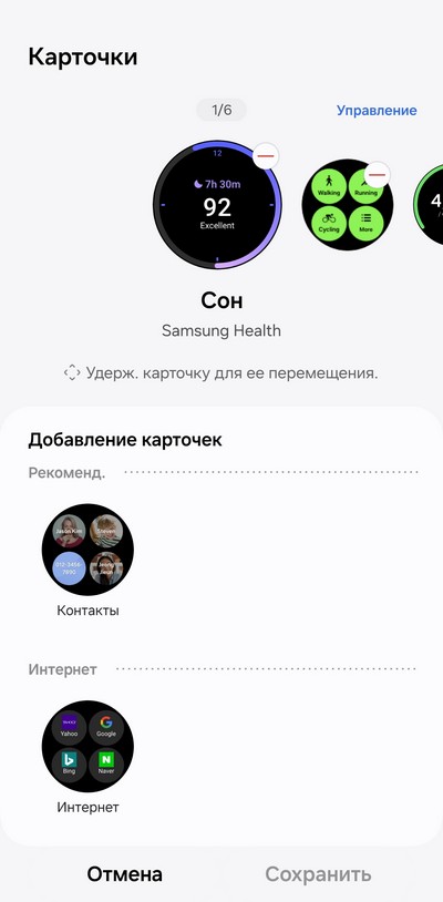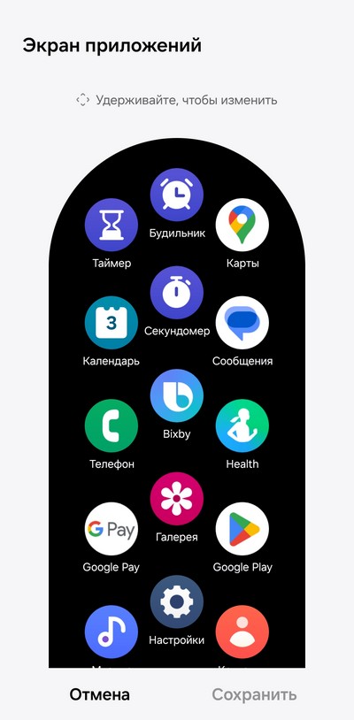 Настройка экрана приложений - там можно изменять порядок пиктограмм, также можно менять вид экрана приложений. Карточки - это виджеты приложений, которые появляются справа от циферблата при прокрутке. Вы сами определяете, какие виджеты вы там хотите видеть.