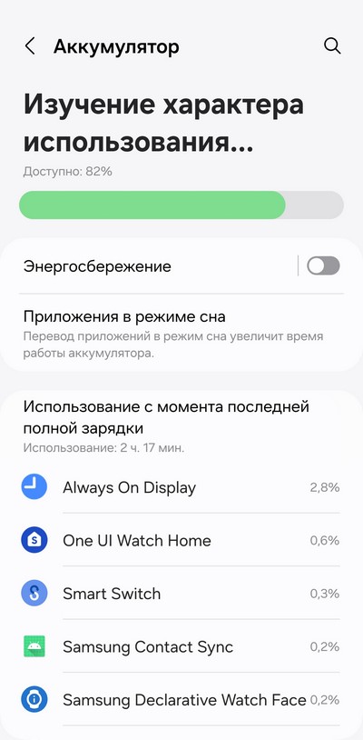 Какой-то разницы по автономности с предыдущей моделью я не заметил. Режим максимальной экономии энергии я, как обычно, не проверял (нет смысла покупать такие часы, чтобы их использовать по минимуму), а в самом активном режиме использования - отслеживание пульса раз в 10 минут в обычном режиме (на тренировке, разумеется, отслеживание идет уже в непрерывном режиме), расширенное отслеживание сна, стресса, уровня оксигенации, определение тренировки, режим AOD, подключение к Wi-Fi, оплата часами, использование всяких приложений, вроде калькулятора, календаря, работа с приложениями, отслеживание часовой тренировки - часы жили где-то два дня. Однако я заметил, что вот именно секундомер почему-то заметно разряжал батарею. Я на силовых тренировках использую секундомер для отдыха между подходами, так вот, когда секундомер работал в течение часа, то он подъедал где-то 8% заряда - это много.