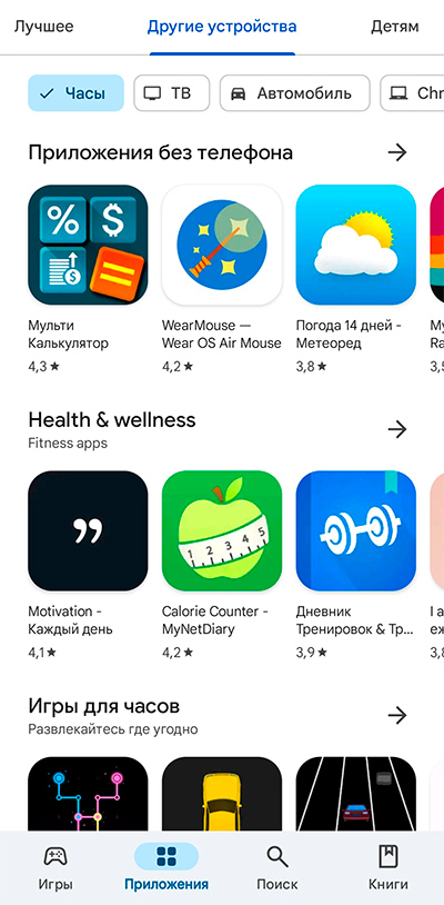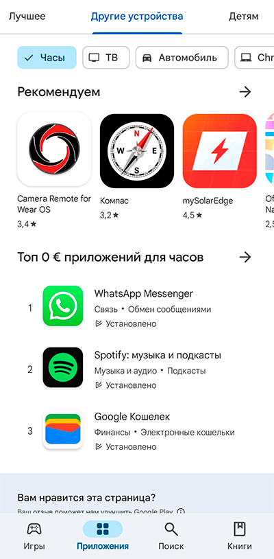 На часы можно устанавливать любые приложения из Google Play: можно это делать прям на часах, но удобнее - из этого приложения на смартфоне.