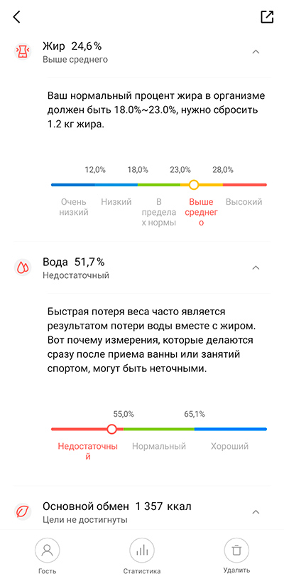 Что странно, при измерении показателей приложение дает комментарии только по поводу BMI - индекса массы тела. По поводу остальных параметров - молчок, хотя там очевидно, что уровень висцерального жира и, соответственно, общего жира в организме явно повышен.
