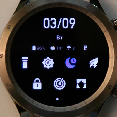 Свайп циферблата вниз - информационные данные (дата, день недели, заряд аккумулятора, погода, сопряжение со смартфоном) и пиктограммы переключаталей: фонарик, настройка дисплея, режим "Не беспокоить", энергосберегающий режим (при этом на экране будут только уровень заряда, дата, время и количество шагов, также часы будут отслеживать сон; постоянно включенного экрана не будет, активизироваться часы будут только по кнопке), блокировка экрана от нажатий (для плавания), поиск телефона (он будет звонить), режим "Театр" (яркость экрана уменьшается, отключается режим постоянно включенного экрана и включение циферблата подъемом запястья) и постоянное включение дисплея в полном режиме (это работает только ограниченное время). Регулировки громкости, как у GTR 2, здесь нет, так как отсутствует динамик.