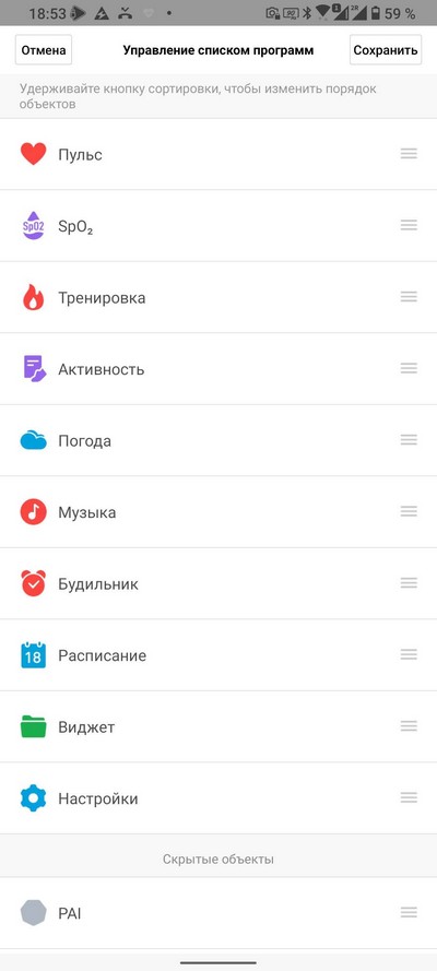 Нижняя кнопка - тренировки. Вообще, тут заявлено до 90 видов тренировок. По умолчанию установлено несколько десятков, но можно добавлять из различных групп, коих не один десяток. Список тренировок можно редактировать прямо в часах.