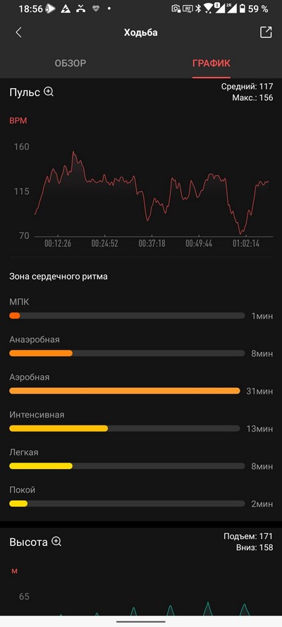Управление часами производится с помощью трех кнопок управления. GTR 2 с той же операционной системой и сенсорным дисплеем обходились двумя, но здесь решили выпендриться, только сделали это как-то странно. Вместо того чтобы сохранить функции верхней (циферблат, список приложений) и нижней (виды тренировок) кнопок, а на среднюю навесить скроллинг и запуск по нажатию, например, какого-то приложения, они функцию нижней кнопки сохранили, на среднюю навесили циферблат, список приложений и скроллинг списка (лишняя возможность, потому что все прекрасно скроллится касанием по экрану), а верхнюю кнопку сделали ненажимаемой, но зато сенсорной (сенсорной, Карл!), назвали ее "Кнопка здоровья", и на нее можно навесить вызов измерения пульса, уровня оксигенации или какой-то странной сущности, которую они почему-то называют "Давление", но что там вообще при этом показывается - одной Huami ведомо. Также замечу, что эта сенсорная кнопка прекрасно дает ложные срабатывания.