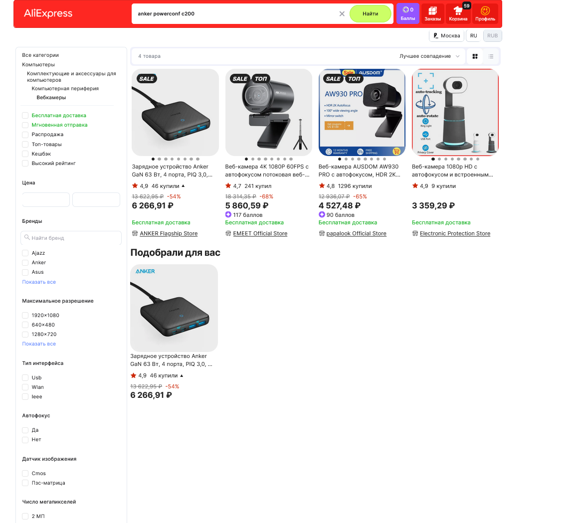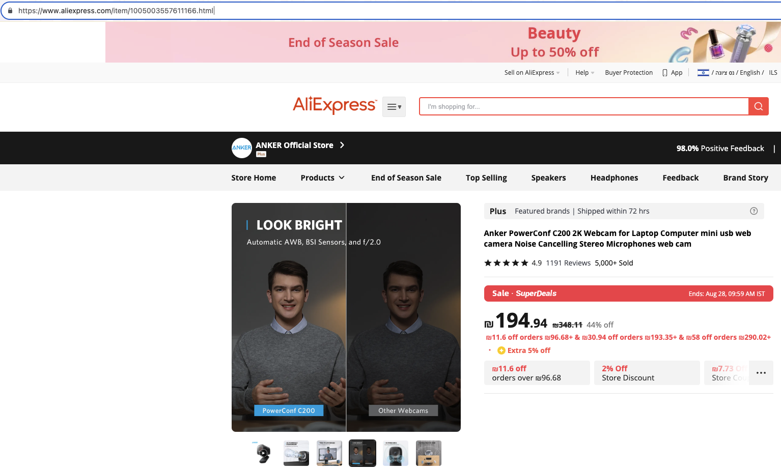 Не знаю в чем проблема, но у меня из рф ссылки на али не существует, и вообще ни по "AnkerWork PowerConf C200", ни по "AnkerWork" али не находит ничего.