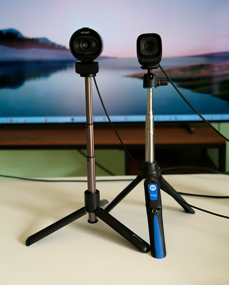 Так как я делаю сравнительный обзор, я эти две камеры установил рядом, чтобы тестировать в одинаковых условиях. Anker PowerConf C200 я использую вот с этим многофункциональным триподом, он намного более устойчивый.