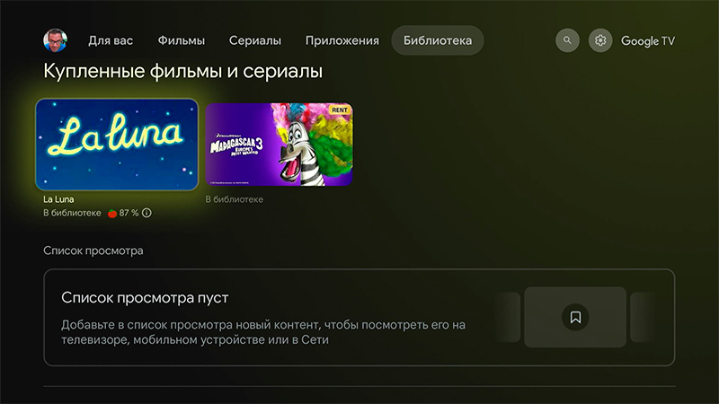Главная страница медиаплеера. Основной раздел система будет подстраивать под ваши предпочтения. Меню сверху - подборка для вас, фильмы, сериалы, приложения, библиотека купленных фильмов и сериалов.