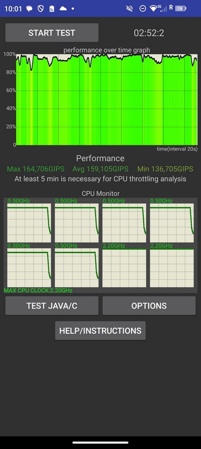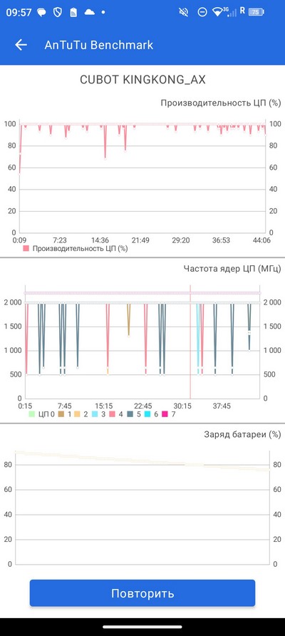 Ну и тест на троттлинг. Потери производительности почти не было.