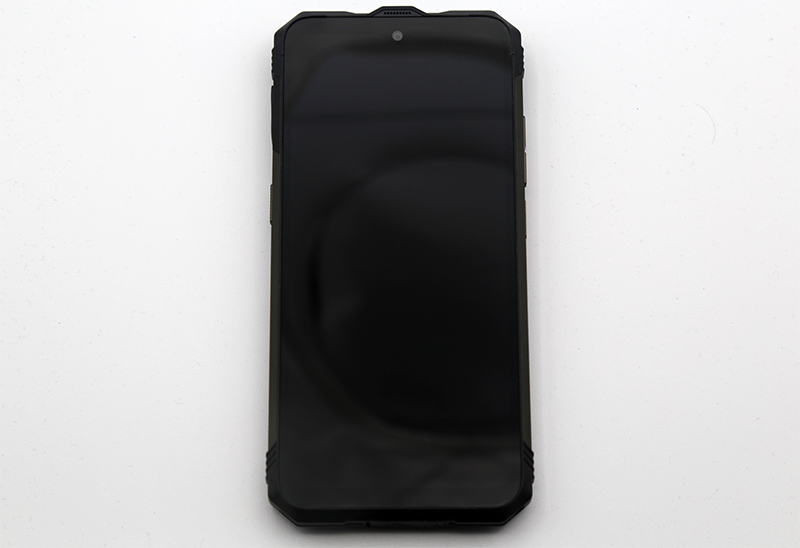 Лицевая часть смартфона - типовая для защищенных смартфонов такого типа. Дисплей покрыт очень прочным стеклом, которое еще и утоплено примерно на миллиметр относительно бортиков - чтобы удар приходился на бортик, а не на стекло. Рама смартфона выполнена из металла.