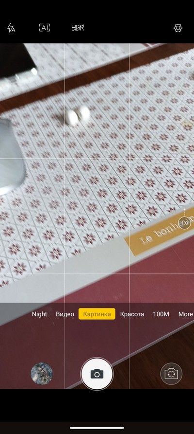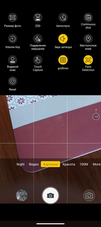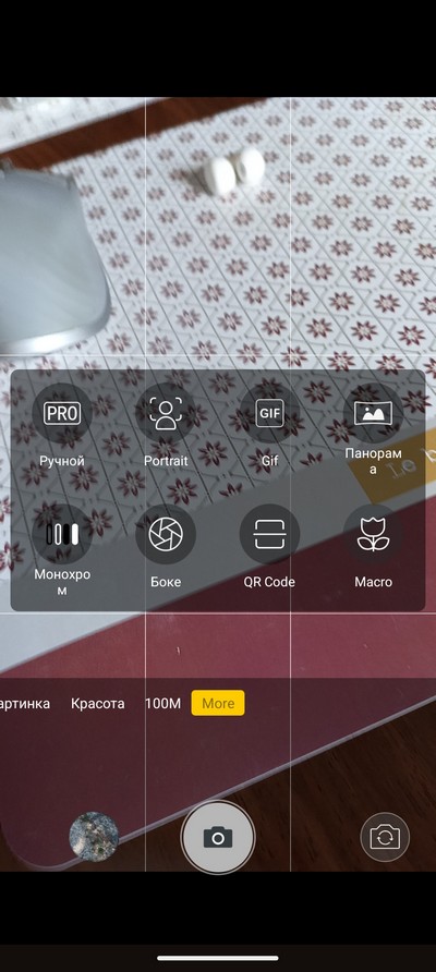 Интерфейс камеры. Снизу переключаются режимы. Сверху - пиктограммы различных переключателей. На правом скриншоте - окно меню с настройками.