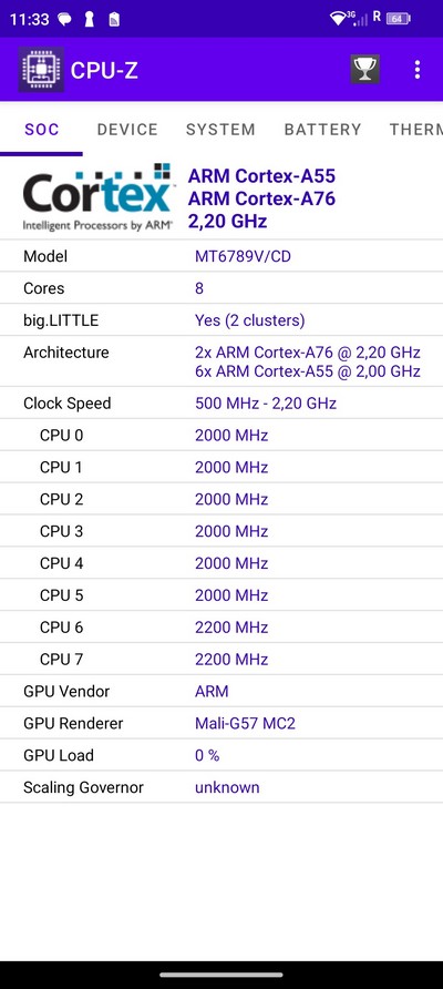 Процессор: Mediatek Helio G99 (6nm), Octa-core (2x2.2 GHz Cortex-A76 & 6x2.0 GHz Cortex-A55)