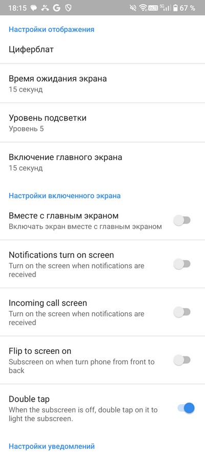 Второй экран, расположенный в центре блока камер, может выводить самую разнообразную информацию, и его работа гибко настраивается. По умолчанию он выводит часы, календарь, аудиоплеер, расход аккумулятора и управление камерой (селфи), но там же можно выводить уведомления от любых приложений и данные шагомера.
