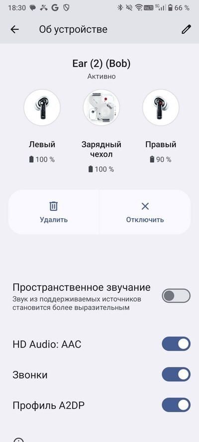 Для проверки беспроводного звучания подключил наушники Nothing Ear (2). Наушники подключились по кодеку AAC. Качество пристойное - терпимые басы, не слишком провисающая середина, неплохие высокие. Уровень максимальной громкости был достаточным для шумного окружения.