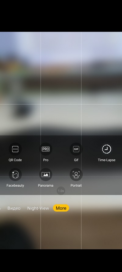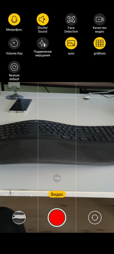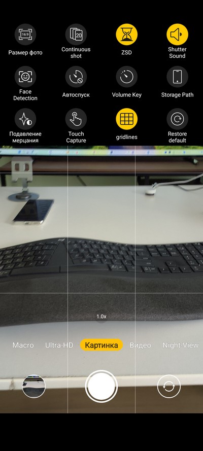 Интерфейс камеры. Снизу переключаются режимы съемки. Сверху - пиктограммы различных переключателей.  Также там вызывается дополнительное меню переключателей.