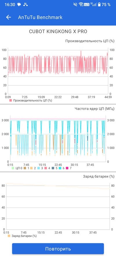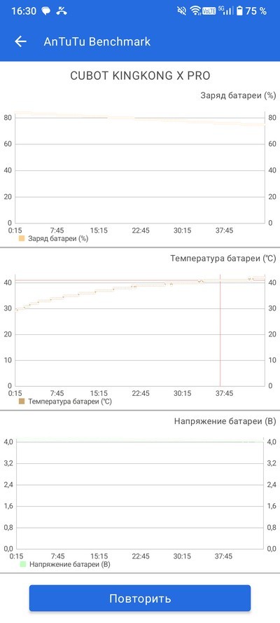 Стресс-тест AnTuTu. Температура батареи немного превысила 40 градусов.