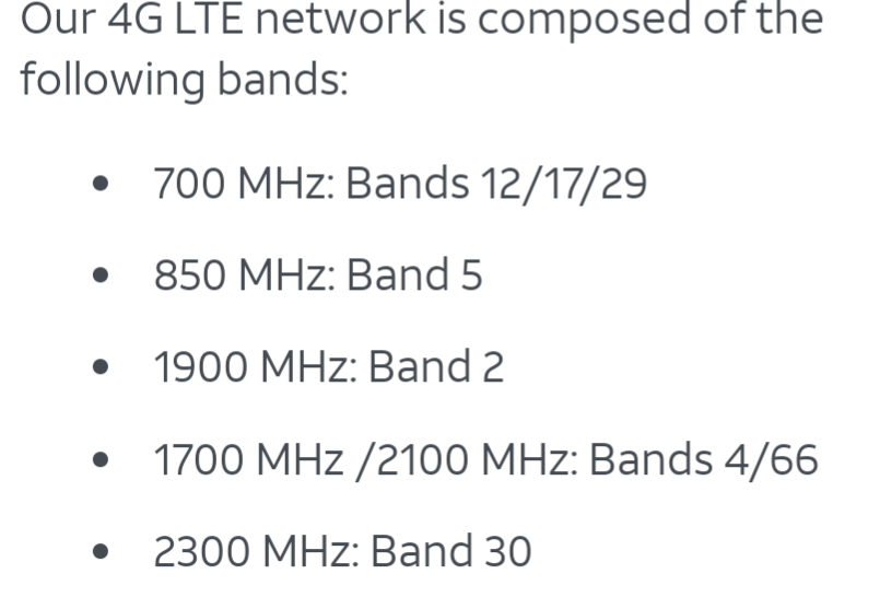Как всегда у всех этих телефонов которые массово не продаются в США не хватает диапазонов. Вот скриншот с сайта AT&T. Ну и где у него 2300 MHz band 30? И ещё чего-то кажется нет. Может повезет и будет всегда работать, а можно и попасть в зону где именно та башня стоИт.