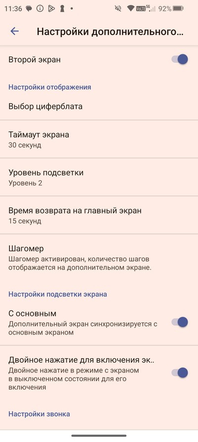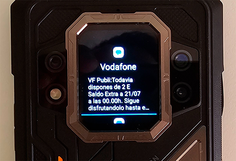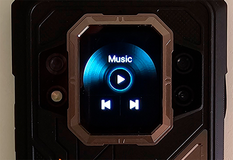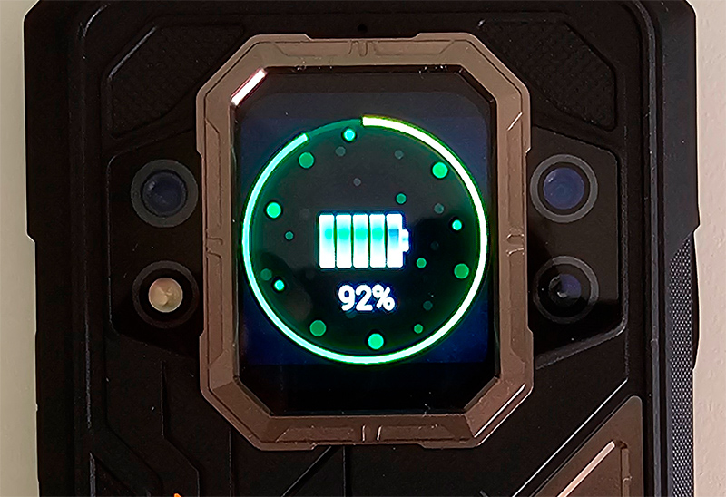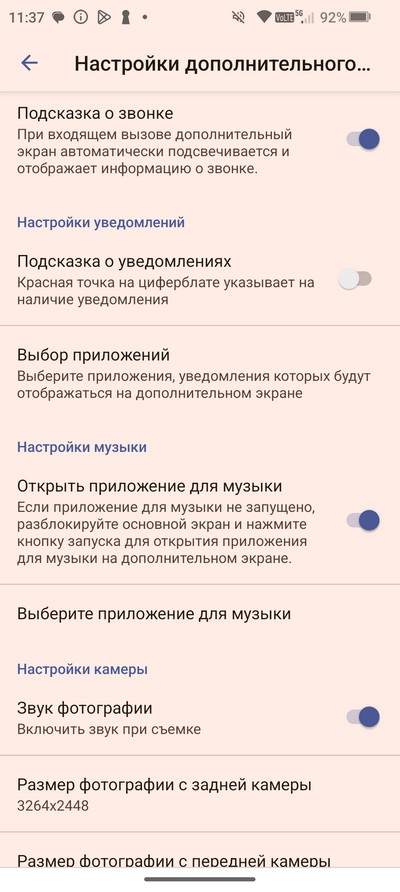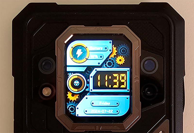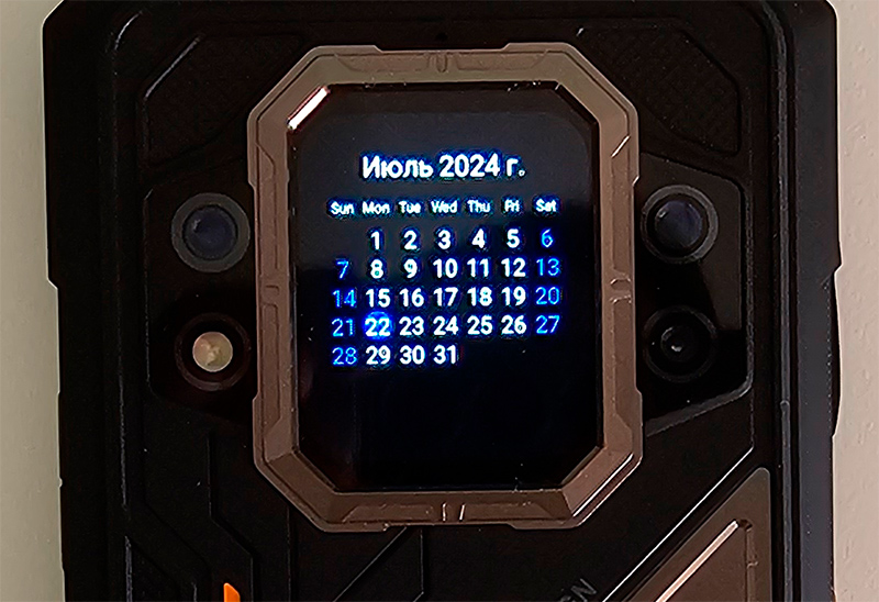 Второй экран, расположенный в центре блока камер, может выводить самую разнообразную информацию, и его работа гибко настраивается. По умолчанию он выводит часы, календарь, аудиоплеер, расход аккумулятора и управление камерой (селфи), но там же можно выводить уведомления от любых приложений и данные шагомера.