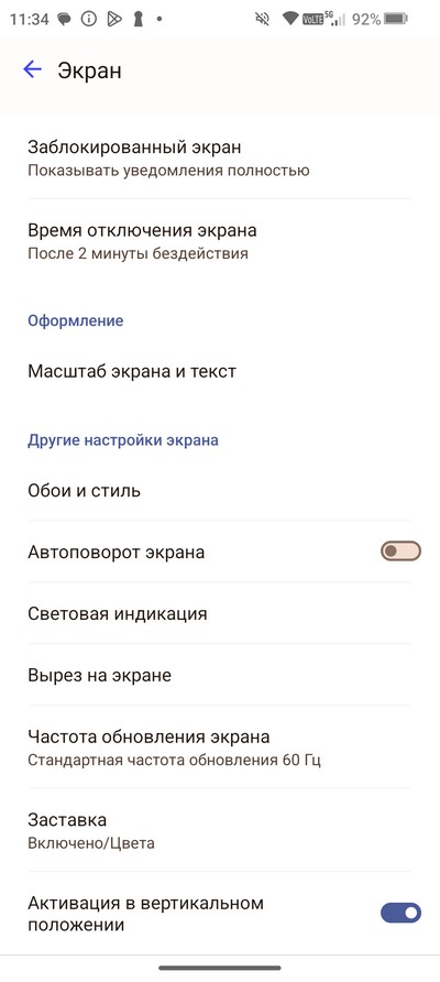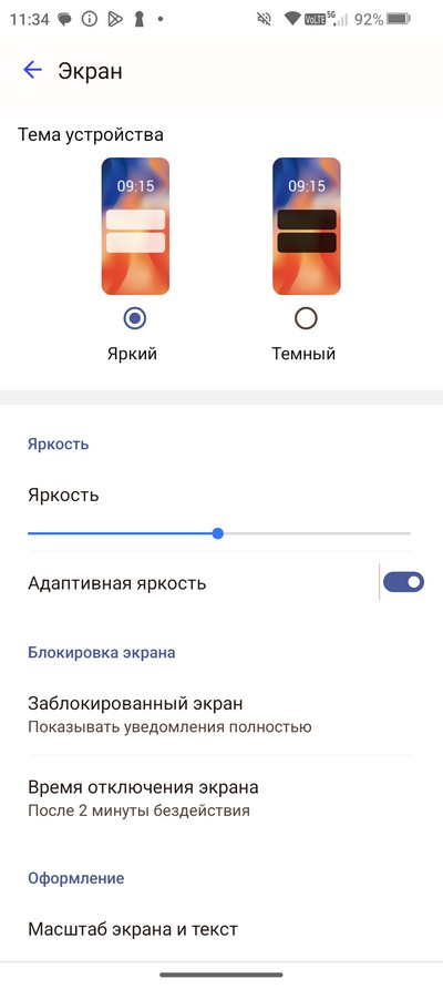 Настройки экрана - стандартные для Android. Есть темный режим, режим чтения, можно настраивать размер шрифта и масштаб.