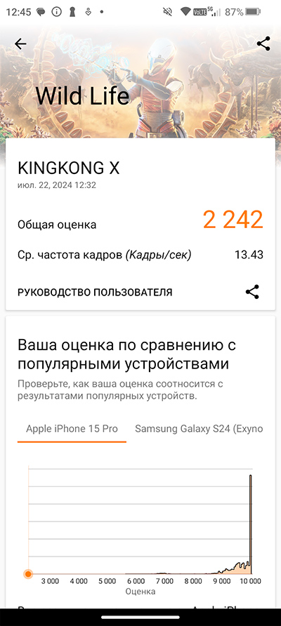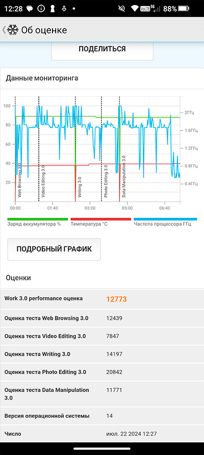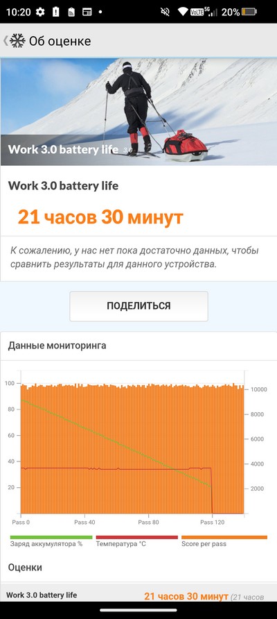 У предыдущей модели PCMark батарейный тест не смог провести, а тут все сработало нормально. Результат - тоже отличный.