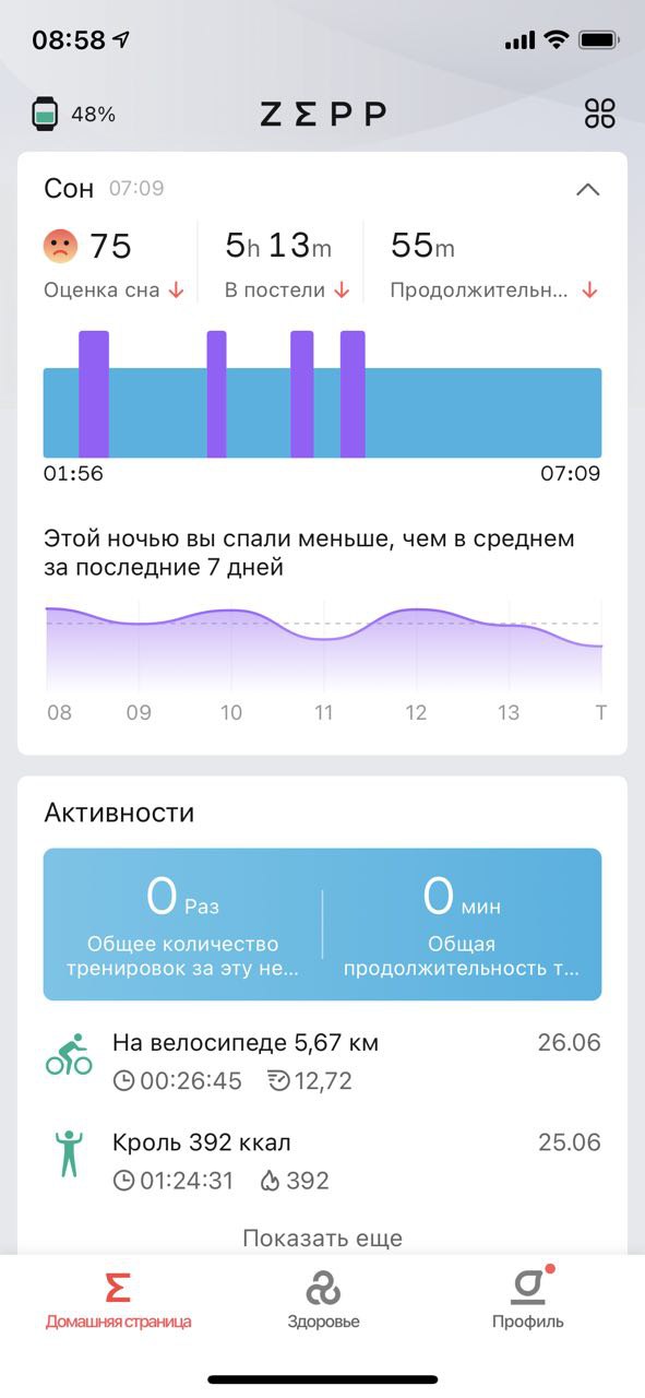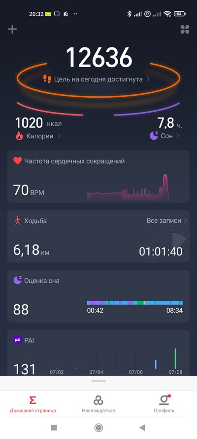 Главная страница приложения Zepp, измерение пульса.