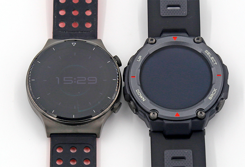 Ну и вот эти часы рядом с Huawei Watch GT 2 Pro. Как видите, по размеру они практически не отличаются: у защищенных часов только безель толще.