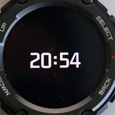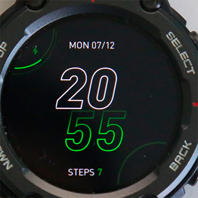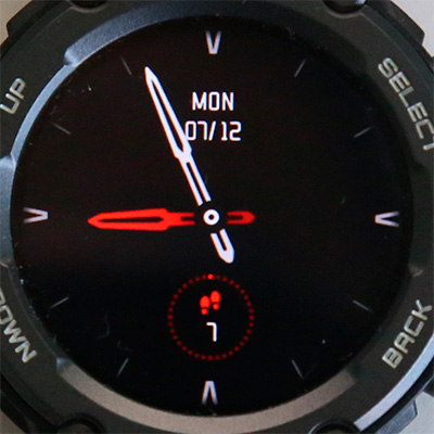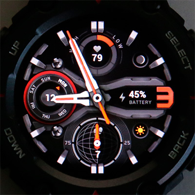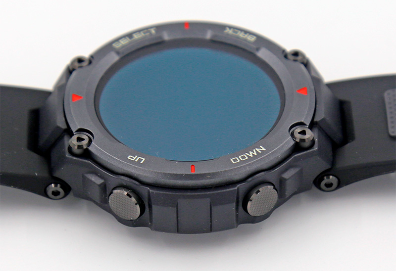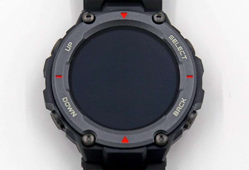 Но вернемся к T-Rex Pro. На безеле часов белыми буквами нанесены названия кнопок: обычно у часов Amazfit по две управляющих кнопки, но здесь кроме двух стандартных "Выбрать" и "Возврат" еще добавили "Вверх" и "Вниз" - для ситуаций, когда по каким-то причинам неудобно управлять часами с помощью сенсорного экрана. Также на безеле есть четыре насечки: на 12, 3, 6 и 9 часов.