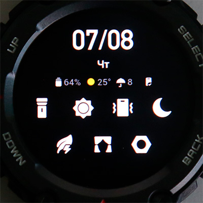 Свайп циферблата вниз - информационные данные (дата, день недели, заряд аккумулятора, погода, сопряжение со смартфоном) и пиктограммы переключаталей: фонарик, настройка дисплея, поиск смартфона, режим "Не беспокоить", энергосберегающий режим (при этом на экране будет только уровень заряда, дата, время и количество шагов, также часы будут отслеживать сон; постоянно включенного экрана не будет, активизироваться часы будут только по кнопке), режим "Театр" (яркость экрана гаснет, и отключается режим постоянно включенного экрана и включение циферблата подъемом запястья) и настройки.