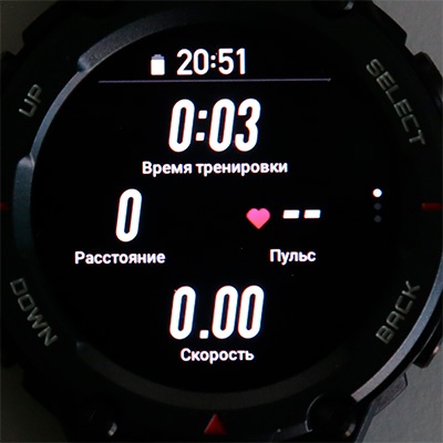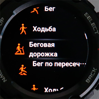 Спортивные режимы (правая верхняя кнопка) и отслеживание тренировки.