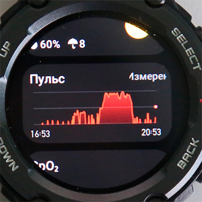 SpO2 - измерение оксигенации (уровня насыщения кислородом) крови. Как это работает - в конце обзора. Замечу, кстати, что эти часы умеют определять подъем на значительную высоту, и в этом случае предлагают владельцу измерить уровень кислорода в крови (в первом T-Rex такой функции не было).