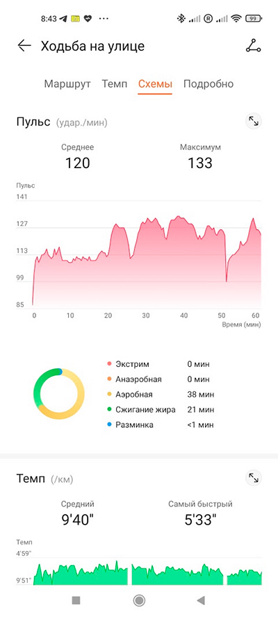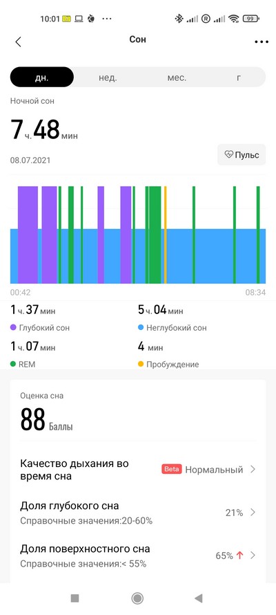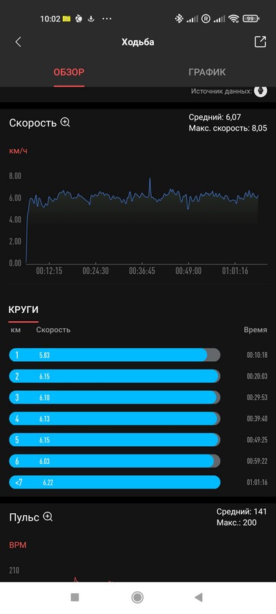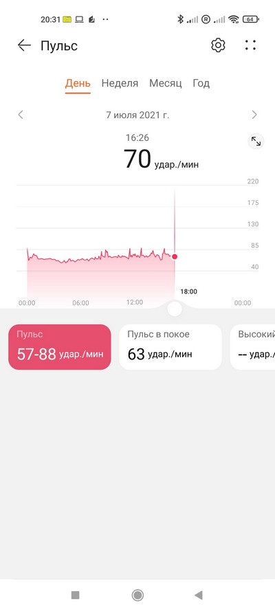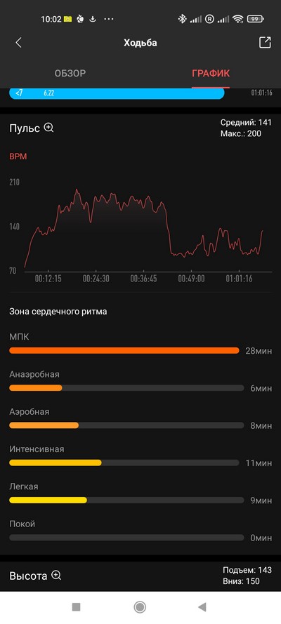 Отслеживание пульса в обычном режиме - в общем, вполне неплохо, более или менее совпадает с данными пульсоксиметра и тонометра, разница могла быть на 1-2 единицы.