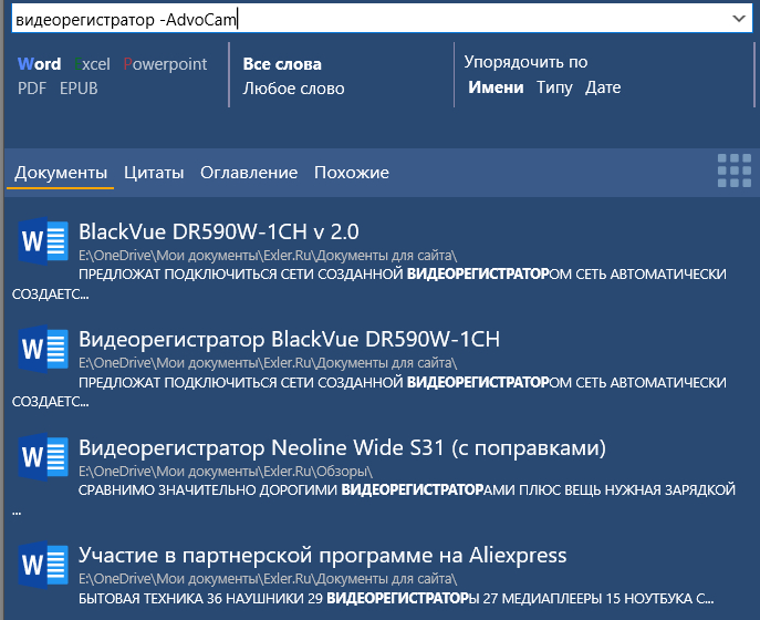 Предположим, нужно исключить все документы с видеорегистратором AdvoCam - задаем запрос: "видеорегистратор -AdvoCam", получаем результат.
