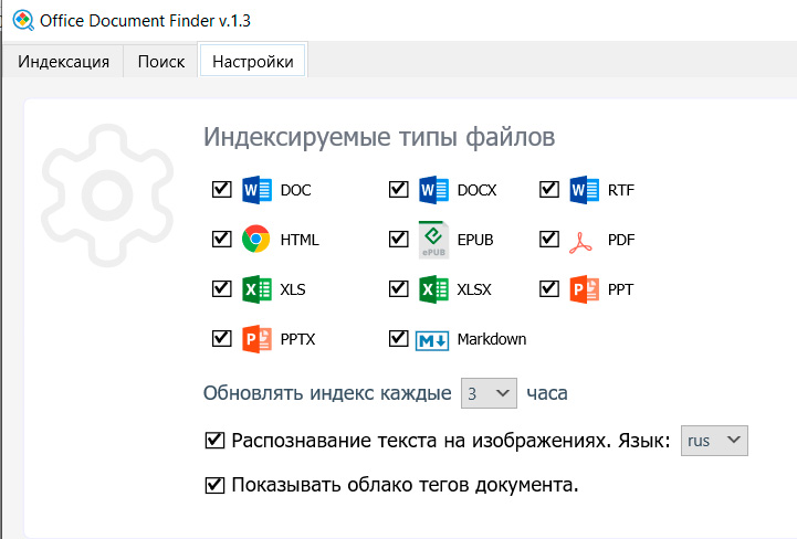 В меню сверху есть раздел "Настройки", там можно выбрать, какие именно виды документов нужно индексировать. Также там задаются частота обновления индекса, возможность распознавания текста на изображениях (например, в PDF-файлах) и показ облака тегов документа.  (Внимание: распознавание текста на изображениях очень сильно замедляет скорость индексации!)