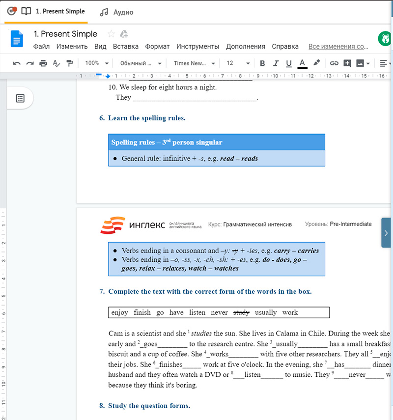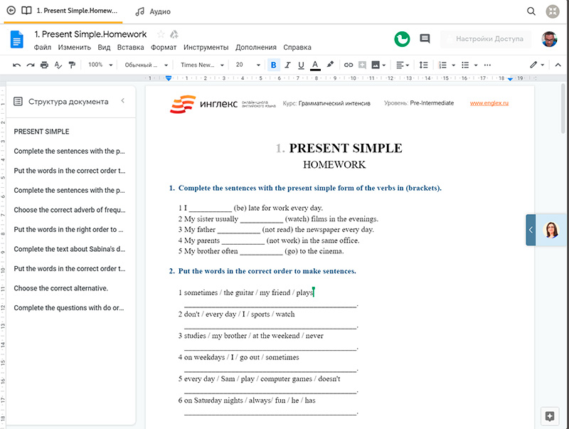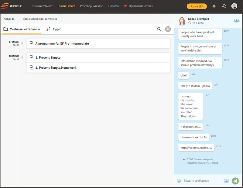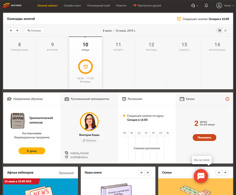 Я выбрал курс "Грамматический интенсив" (у меня проблемы с английской грамматикой), и мы с преподавателем составили план занятий - это все отражается в личном кабинете.