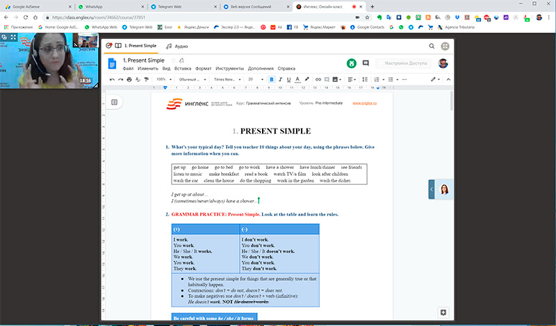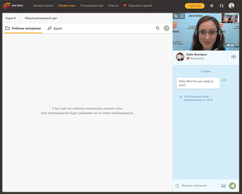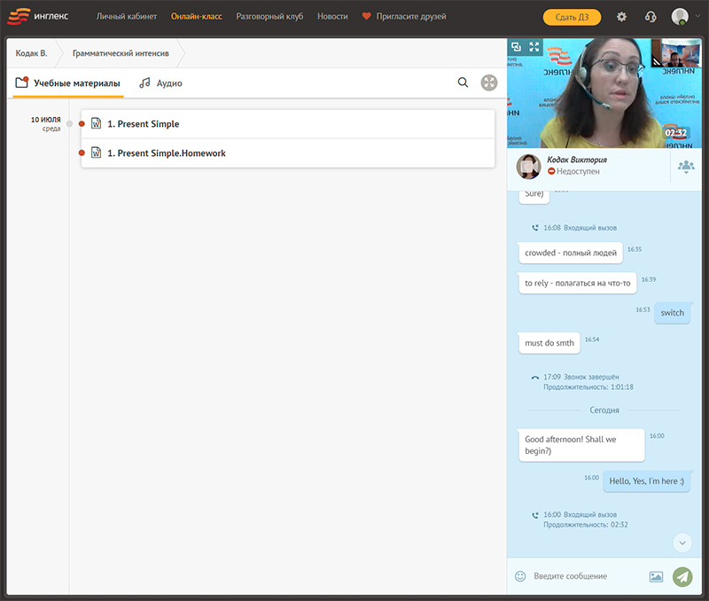 Начался тестовый урок в личном кабинете. Видео с преподавателем можно распахивать на весь экран, уменьшать, помещать в удобное вам место. Чат с преподавателем можно скрывать. Преподаватель ваши знания будет оценивать в комплексе: умение вести разговор, восприятие речи на слух, также будут предложены упражнения на знание грамматики.