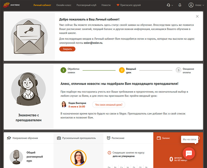 С вами согласовывают время проведения тестового урока, перед уроком придет соответствующее напоминание.