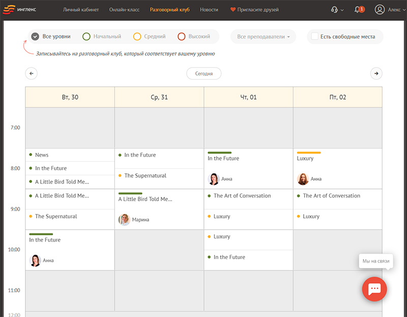 Для этих разговорных клубов есть свое расписание: там показаны будущие встречи, в которых можно принять участие, и их уровни сложности.
