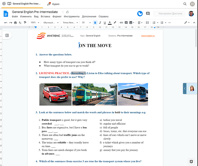 Первое занятие - преподаватель подготовил для меня соответствующие материалы, которые появились в соответствующем разделе кабинета. Начинается занятие с разговора с преподавателем на всякие бытовые темы. После этого начинается обучение и закрепление усвоенного путем выполнения упражнений. Если что-то непонятно, то преподаватель подробно объясняет сложные моменты. И в процессе занятия также присутствуют разнообразные виды освоения языка: беседа, аудирование (просмотр видеороликов и ответы на вопросы), изучение текстового материала, выполнение упражнений. За одно занятие я успел выполнить восемь упражнений, остальные восемь были заданы в качестве домашнего задания.