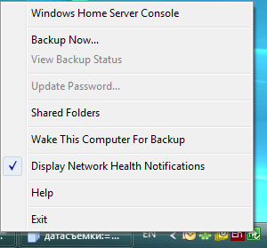 После установки программного обеспечения в системной области уведомлений появился специальный значок, который, во-первых, демонстрирует статус сервера (подключен, не подключен, есть проблемы в конфигурации), вызывает консоль Windows Home Server, показывает расшаренные папки, запускает бекап и так далее.