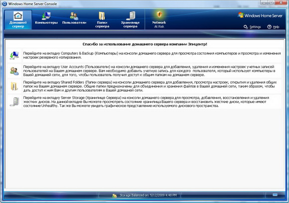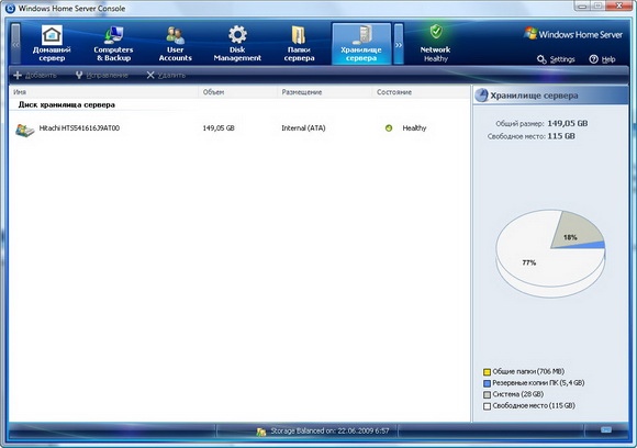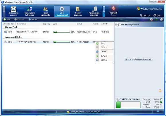 Здесь демонстрируется статус установленных и подключенных дисков, можно подключать и настраивать новые диски (в том числе внешние), задавать вайрфреймы и так далее. Если к серверу подключаются новые устройства, то WHS предлагает их присоединить к общему пулу - в этом случае вся информация на устройстве будет потеряна. (Это простое знание стоило мне примерно пятисот гигабайт информации на внешнем диске - исключительно от невнимательности, потому что WHS обо всем честно предупреждает. С другой стороны, там все равно была записана только порнуха статья о политональных наложениях у Бетховена, так что как бы и черт с ней.)