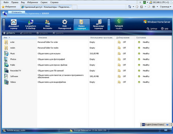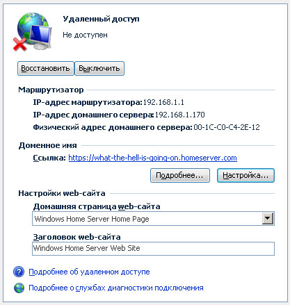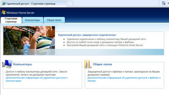 Удаленный доступ. Еще одна важная особенность этой операционной системы. WHS предоставляет удаленный доступ к самому домашнему серверу и к подключенным к нему компьютерам через Интернет. Удаленный доступ осуществляется через удобный веб-интерфейс и поддерживается с помощью бесплатных пользовательских доменов homeserver.com учетной записи в Windows Live (имя сервера будет что-то вроде user.homeserver.com).