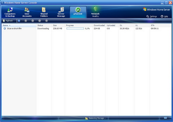 uTorrent-плагин в данном случае - это, конечно, не полнофункциональный клиент, а интерфейс для консоли, использующий uTorrent WebGUI. То есть сначала вам нужно будет через удаленный десктоп установить на Windows Home Server обычный клиент uTorrent, затем настроить в нем веб-интерфейс, после чего данный плагин позволит управлять этим клиентом из консоли Windows Home Server.