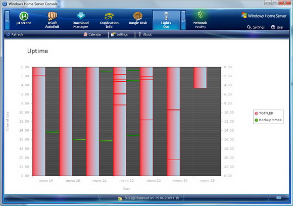 Вот, собственно, и все, что по умолчанию предлагается в клиенте Windows Home Server. "Как это все? - можете спросить вы. - А где параметры работы сервера - температура процессора, материнской платы и жестких дисков, где торрент-клиент, где нормальное бекапирование, где управление режимом "засыпания", где?.." Спрашивать, собственно, можно до бесконечности, потому что каждый пользователь от сервера требует свое.
