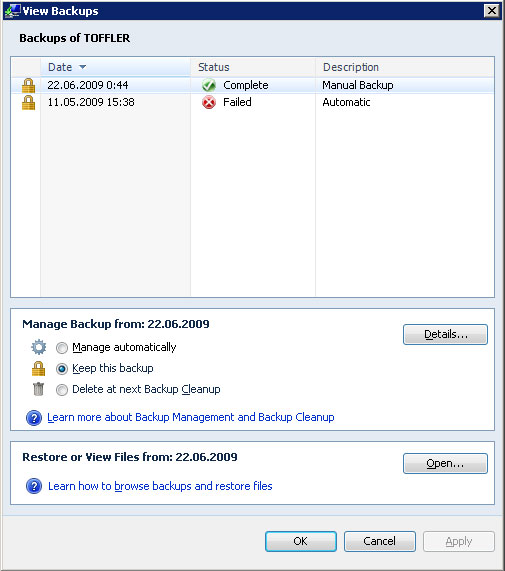 В этих настройках можно выбирать только вид обработки бекапа: вручную удалять, сохранять всегда, удалять после успешного следующего бекапа.
